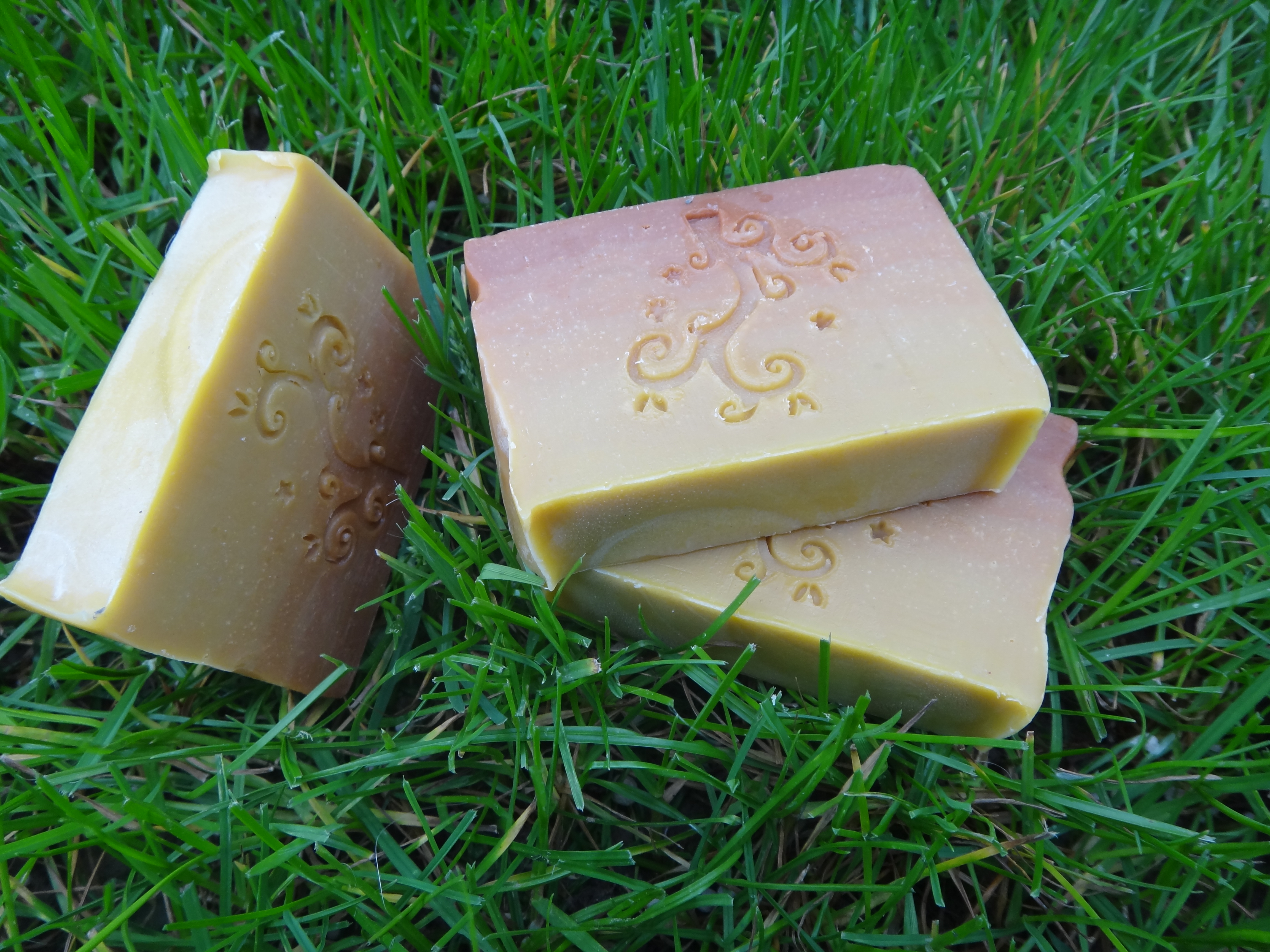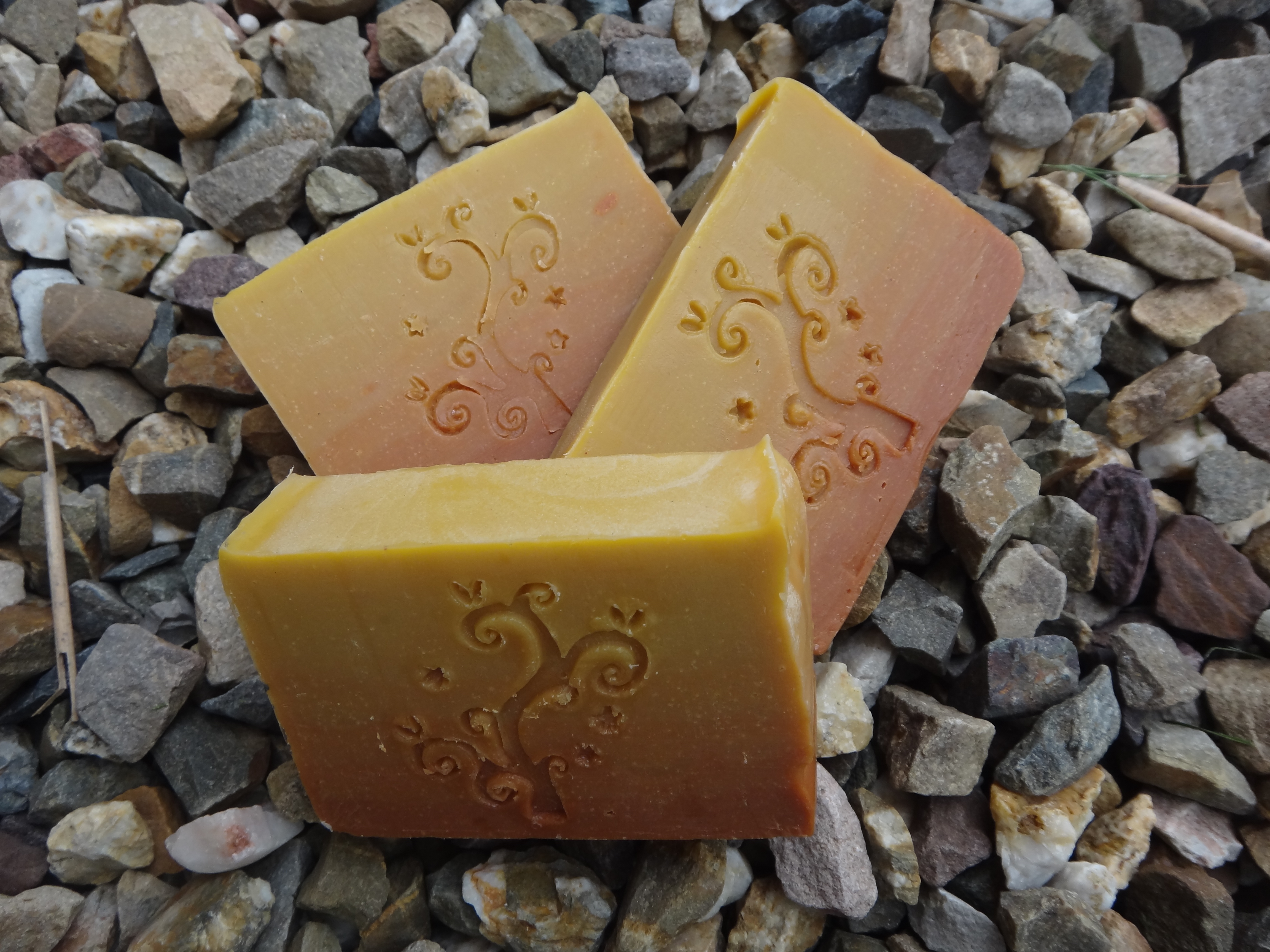 I believe this is my favourite challenge…because of its simplicity. I found the blue soap made by Amy so lovely that I couldn’t wait trying my own gradure colours soap. As for the previous technique I had to use colorants, this time I was content to use only natural ingredients. My first experience: red clay and carrotjuice scented with niaouli, as I wanted this soap to be a facial one. Maybe I should have started with a darker colour …What I like is the fact the colour changes from dark to light without seeing the layers.
