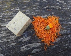 Ingredients: coconut oil, palm oil, calendula infused in olive oil, shea butter, grapeseed oil, safflower oil, castor oil, green clay, calendula petals.