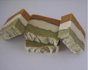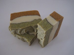 Savon fait à base de lait de chèvre et de poudres naturelles: d’urucum( couche en-dessous) et d’ortie( au-dessus).