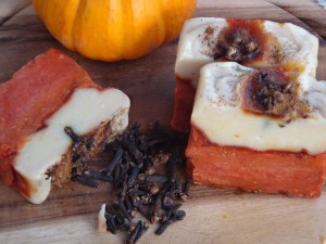 I spent a lot of time thinking which essential oil to use in my soaps, as I want to make a synergie which wouldn’t go wrong and, when a colleague brought some spice bread/ pain d’épices at work( a typical French bread made of a mix of spices like cinnamon , ginger, clove , anise , muscade) I was very delighted to discover some spices I haven’t used before like clove bud or anis , for example. So I decided to try a new essential oil blend – clove bud – for my pumpkin soap, combined with cinnamon essential oil.