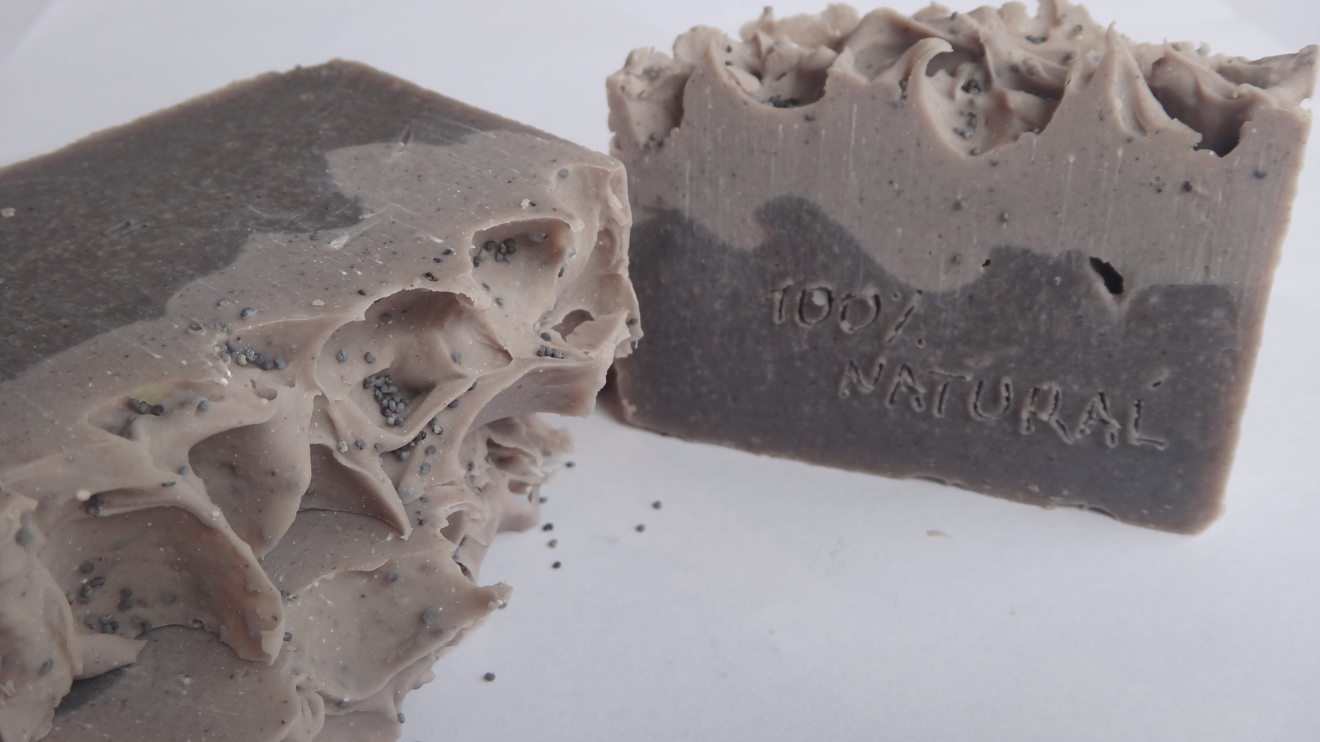Soap made of castor oil, grapeseed oil, coconut oil, olive oil, shea butter, palm oil, almond oil, Eucalyptus Citriodora essential oil , zinc oxide. I have used an ingredient which I have never used before and which gave the soap this rustic dark grey colour. For the  upper layer I used some oxid zinc.