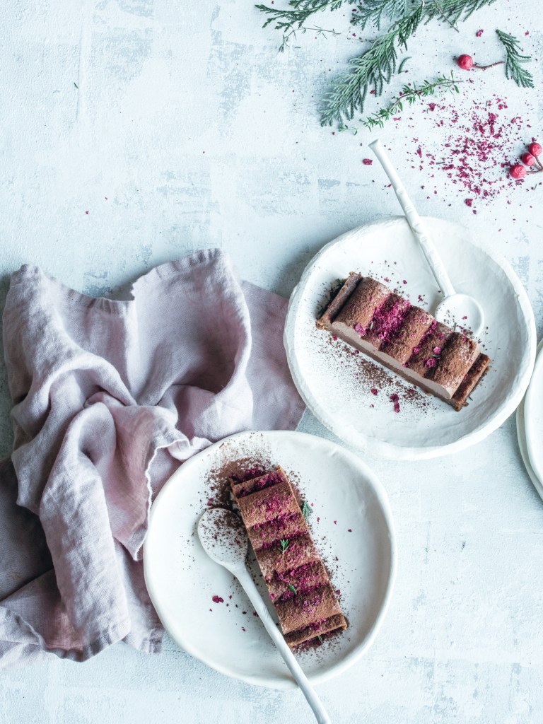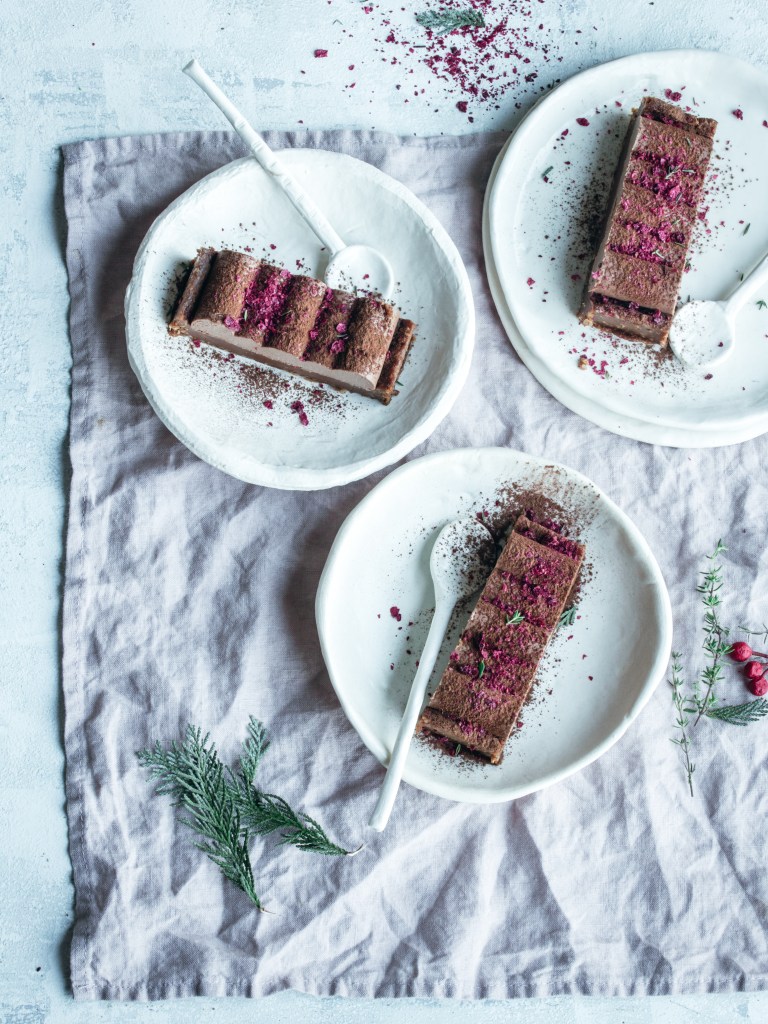 Mix all the ingredients in a blender until everything is smooth and homogenous. You have to get a creamy consistency . Here I used a Silikomart mold to get a nicely effect but if you don’t have it, you can pour the cream over the dark chocolate layer, smoothing out. Set the cake in the freezeer for some 4 hours or overnight. Before serving, decorate it with some cacao powder and dry flowers.