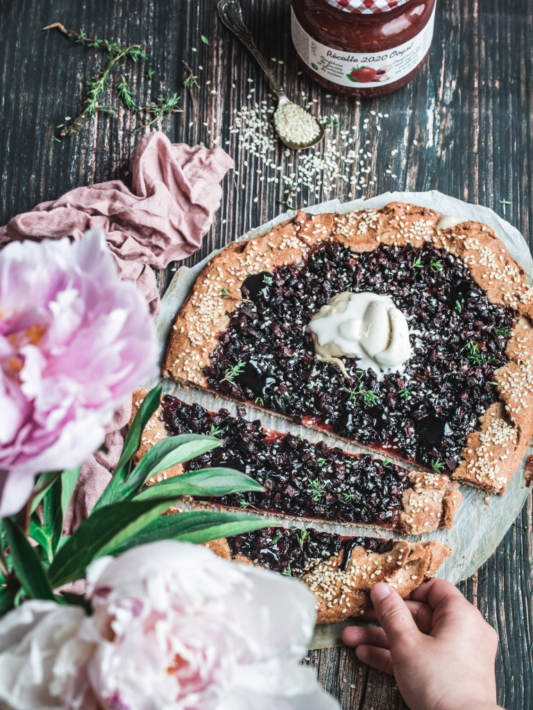 The pastry is a combination of coconut/oats/buckwheat flour, coconut oil salt and water. The filling contains the Materne strawberries/rhubarb jam as first layer, followed by the layers of roasted beets. We decorated it with sesam seeds and balsamico and of course with lots of thyme.