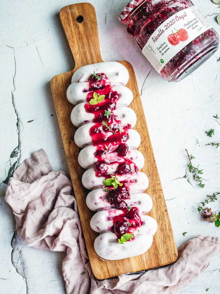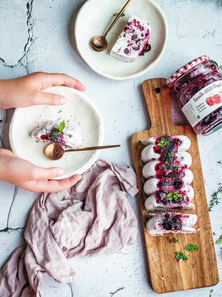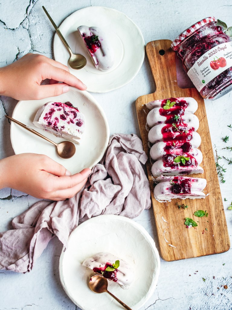 No summer without ice cream. Even if this summer is quite a challenging one and nothing seems sure. But one thing is sure: we need ice cream in the summer. And an easy one to make. I love easy recipes but I also love those recipes which could be done in advance and save some time for when you have guests. This can be done in small molds or in a bigger one, as we did, and cut before serving. The beauty of this recipe relies on the delicious cherry jam from Materne, which are made from fresh cherries. I am not a jam fan in generally but this sour-sweet jam is really an addictive one. You can use it as spread on your bread but here we love it especially in our green salads. I would usually use honey/dates for my ‘vegan’ ice creams like this one, but with this jam you add some texture, color and also a sweet taste to your ice cream.