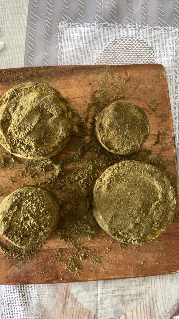 This step can be a mess sometimes so don’t worry and just try to follow the instructions. Once you unmold your cheese, place your cheese on some kitchen wood where you will try to cover your cheese with your choosen powder: in my case I used hemp powder( but I recommend you use sumac powder or garlic powder in case it’s the 1st time you make it). The cheese is still frozen so covering it with powder would look difficult but just go on and and try to add it as much as you can. The cheese should be covered in your choosen powder.