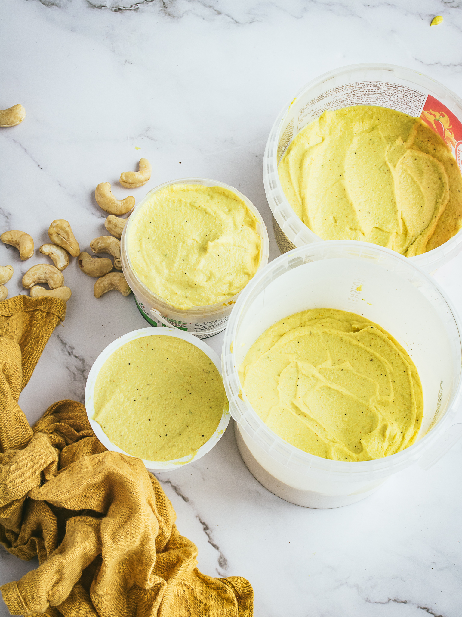 Let the cashews soak in water during one night. The day after, wash the nuts well and add them to the blender, also adding the rest of the ingredients and 200-210gr water. Mix it very well. You will need to stop from time to time and let you mixer rest a little bit and then continue. Also you can add more turmeric if you think that the color is not deep for you. Try it and add, if needed, some more salt/peper. Pour the mixture into 4 different empty recipients (like the ones I used, something easy to unmold or use some plastic). Put these filled with cheese recipients in the frizer.