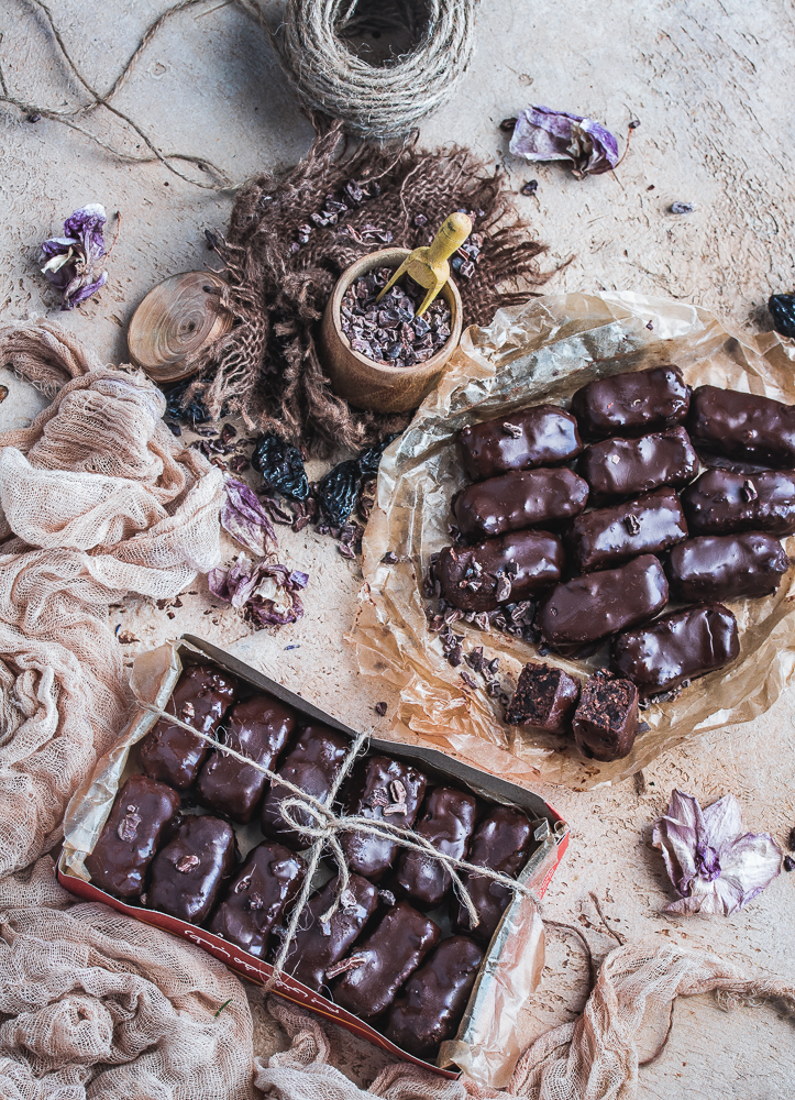 These sweets need no presentation! But if you have never heard about them, know that in Moldova these are the most sold sweets, and well known in Romania too. I already made different versions of them but now I want to show this recipe which is even closer to the original one and still is healthy as it has no sugar or other strange ingredients. Made mainly of dried plums and cacao nibs, and optionally you can add some vanilla powder. I also cover them in dark chocolate (made home out of cacao massa and coconut butter, so no sugar involved here again, but you can use your healthy version of dark chocolate too).