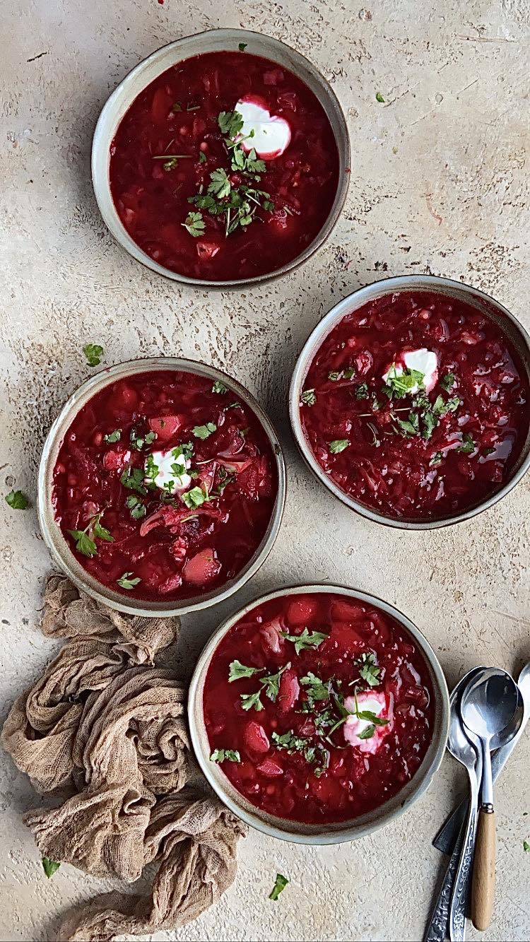 Having an Ukranian mother, there is no surprise telling you that this is the soup we ate more than any other one as kids. My mom used to make this quite often, I remember having the same soup for 2-3 days with rye bread. That is what I also prepare here usually. Especially the days I have lots of work and no time to stay in the kitchen. Luckily the girls love it and don’t bother having the same soup for 2-3 days. I would not call it a’ recipe’ as I make it depending on the vegetables I have at home, but my mom would make it always with red beans and lots of cabbage. The essential ingredients to make it are, of course, the beets but also the fresh dille. You can make it with or without meat (chicken), when making it without meat you should add some more broth powder and some ghee to make the soup creamier. Here is the ingredients list for 3lt of soup. If using bio vegetables, no need to peel them, just wash them very well and cut them.
