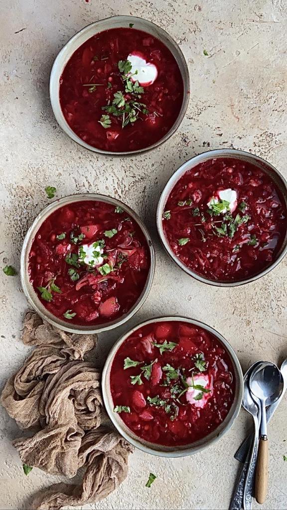 In a big saucepan, add the ghee , the meat (if you are using it), the sliced onion, the grated carrots and put it on the high heat. Mix for several minutes until the onion turns translucid. Add 2-3L of water, the broth, the potatoes, the leek, the caggabe and the bay leaves and let it cook on a medium heat. It can take up to 30 -40 min. Once the potatoes are cooked (and the meat, if you are using it), add the grated beets, the salt, pepper and let it cook for another 10 min. The idea is not to have the beets overcooked. After this step, you can add the lemon juice(or the other liquids as mentioned above) and the other fresh minced greens. Taste the soup and add some more powdered broth/salt if needed. Serve the soup with the sour cream and enjoy a little bit of Ukrainian kitchen.